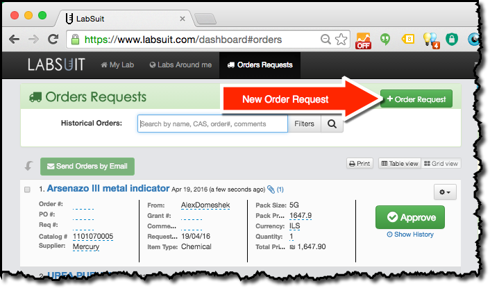 Tell your lab manager what you want to order by submitting new order requests in your group. Once you build up an order history, you can search through it and request items you've ordered before.